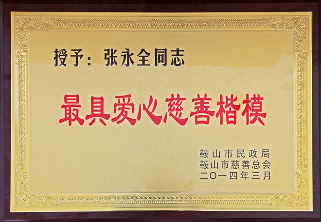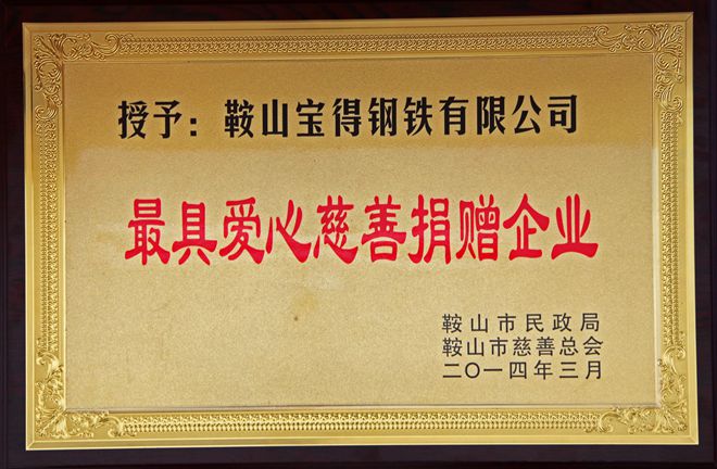 3月7日,在鞍山市慈善總會第三次會員大會上,公司榮獲“最具愛心慈善捐贈企業(yè)”、“最具影響力慈善項(xiàng)目”榮譽(yù),董事長榮獲“最具愛愛心慈善楷模”榮譽(yù)稱號。